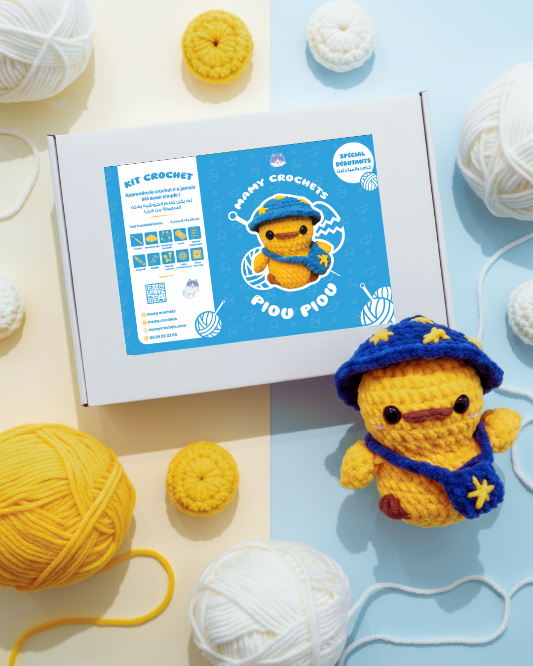 Avec son duvet jaune et son air malicieux, il t’invite à découvrir l’univers magique du crochet, pas à pas, tout en douceur.